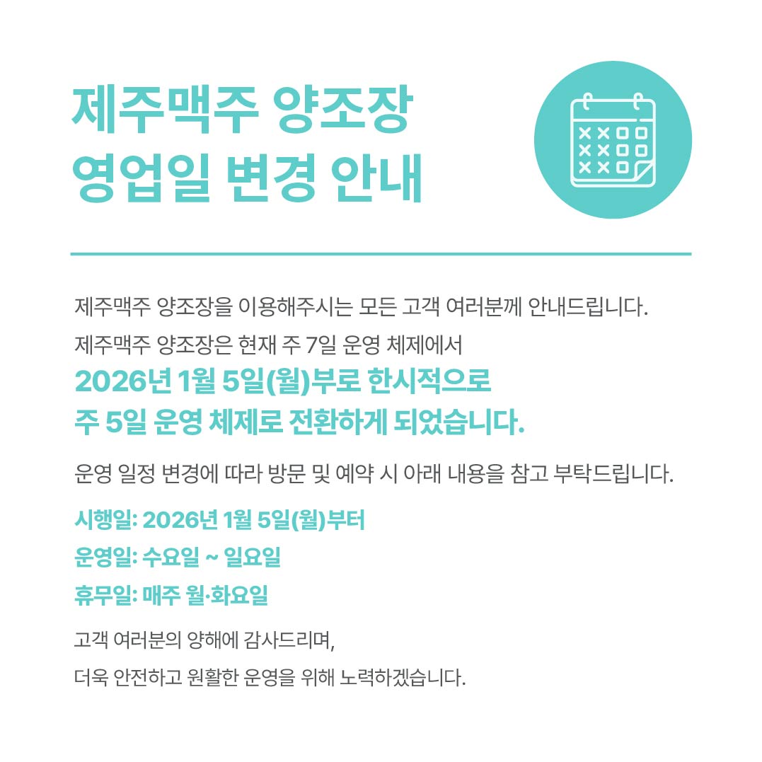 주식회사 한울앤제주 대표 김백산 본사) 제주특별자치도 제주시 한림읍 금능농공길 62-11 성남사무실) 경기 성남시 분당구 운중로 135, 7층 호스팅 제공자 (주)아임웹 사업자등록번호 616-86-27415 통신판매업신고번호 제 2020-제주한림-0101 호 고객센터 02-2235-5559⎟jejubeer@jejubeer.co.kr